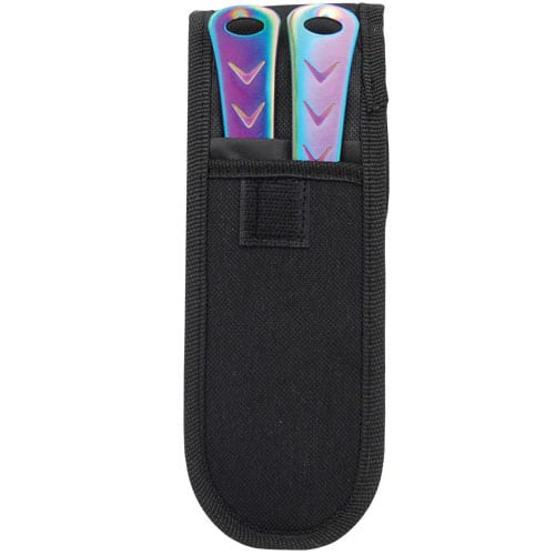 2 Piece Throwing Knife Plasma Color . 7.5″ Length, 2 Piece Set, made from 440 stainless steel, great beginner to intermediate throwing knife. Includes sheath pouch for knives.